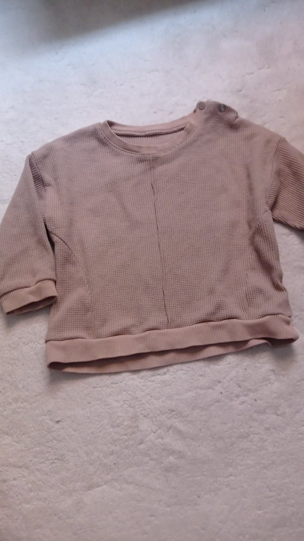 Kız çocukları için rahat kesim, bisiklet yaka ve uzun kollu bej sweatshirt. Yumuşak keten kumaştan, omuzda düğme detaylı.