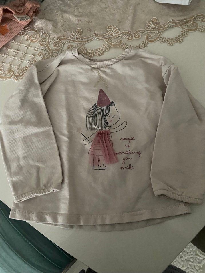 Bej renkli, uzun kollu, bol kesim kız çocuk tişörtü, yumuşak örme pamuktan üretilmiştir. Bohem tarzda, baskılı kız figürü ve yazı içerir.