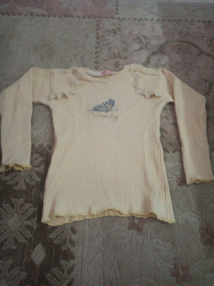 Bej renkli, uzun kollu, triko kumaştan yapılmış kız çocuk bluzu. Vücuda oturan kesimi, bisiklet yaka ve zarif örme detaylarıyla dikkat çeker. Önde kelebek ve "Beauty" yazısı bulunur.