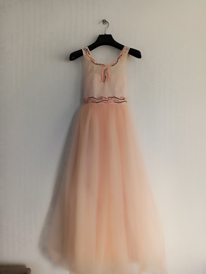 Bej renkli, kolsuz, V yakalı ve nakışlı kız çocuk elbisesi. Modern klasik tarzda, drapeli ve vücuda oturan kesimlidir. Yumuşak sentetik kumaştan üretilmiştir.