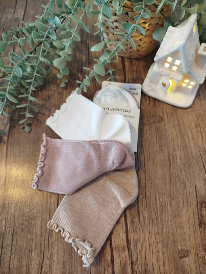 Kız çocukları için bej ve pastel renklerde, triko kumaştan, narin fırfırlı kenar detaylı üçlü çorap seti. Günlük kullanım için yumuşak ve rahat. #oysho #oyshocorap