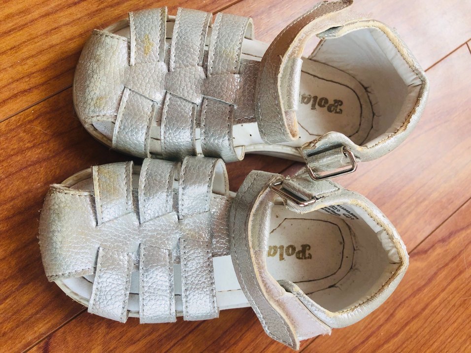 Bej yılan desenli deri sandalet, tokalı ve kız çocuklar için şık bir seçenek.