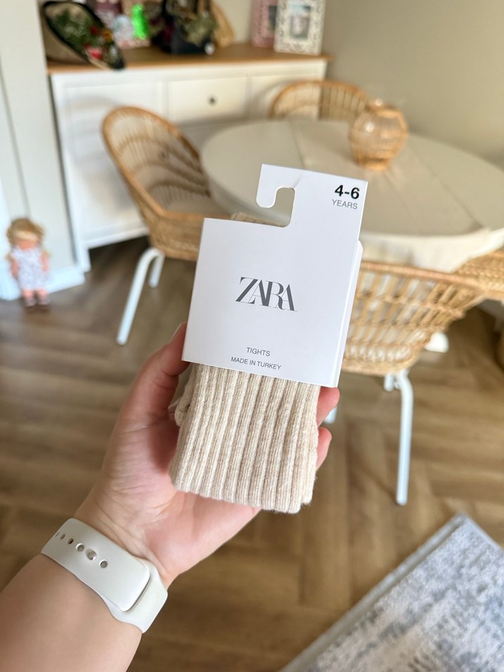 Zara markalı, 4-6 yaş kız çocukları için bej renkli, yün dokulu baskılı çorap. Yumuşak ve sıcak tutar.