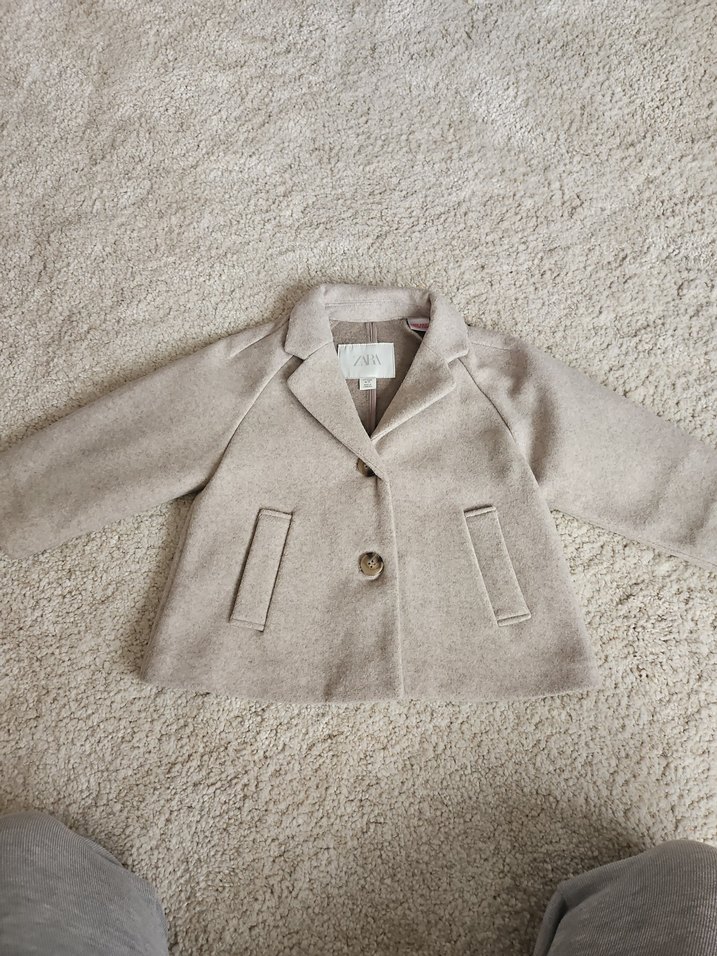 Bej renk, yün kumaştan yapılmış kız çocuk kabanı. Notch yaka, kürk detaylı ve düz model. Modern klasik tarzda, rahat kesim.