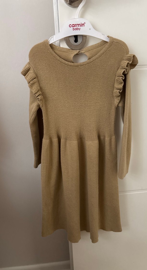 Bej renkte, yün kumaştan yapılmış, uzun kollu ve yuvarlak yakalı kız çocuk elbisesi. Omuzlarda volan detayı ve bol kesim ile bohem tarzda tasarlanmıştır.