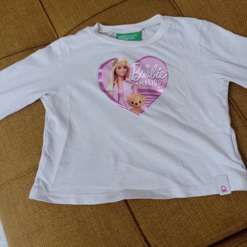 Beyaz kız çocuk tişörtü, yuvarlak yaka, kısa kollu ve bol kesimdir. Pastel Barbie Malibu baskısı ve düğme detayı vardır, pamuklu yumuşak kumaştan üretilmiştir. İki kez kullanılmıştır
