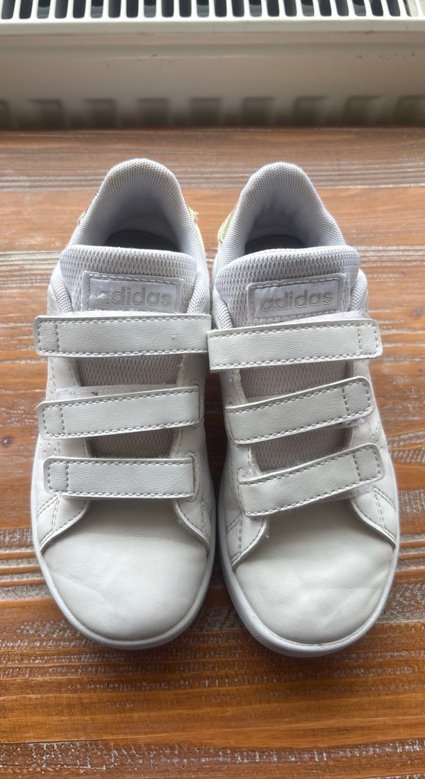 30.5 no Beyaz Adidas kız çocuk spor ayakkabısı, üç cırt cırtlı bant ve kauçuk taban ile sade ve temiz bir görünüm sunar. ♀️