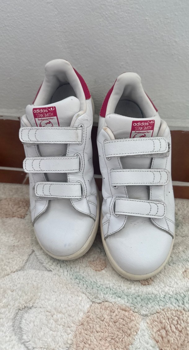 Üç cırt cırtlı beyaz Adidas spor ayakkabılar, lastik tabanlı ve topuk kısmında renkli detaylı, sade tasarıma sahip. Trendy günlük kullanım için uygun.