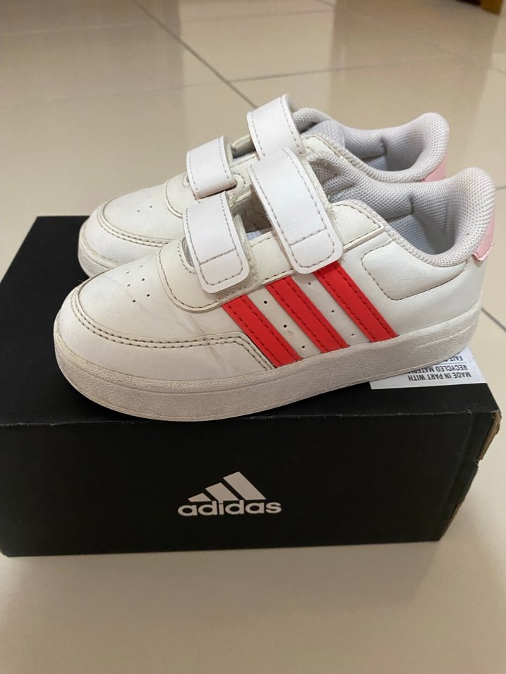 Beyaz Adidas kız çocuk spor ayakkabısı, cırt cırtlı ve kırmızı şeritli. Kauçuk tabanlı, sokak stili için uygun, rahat ve trend bir model. Çok sayılı kullandı kızımız.