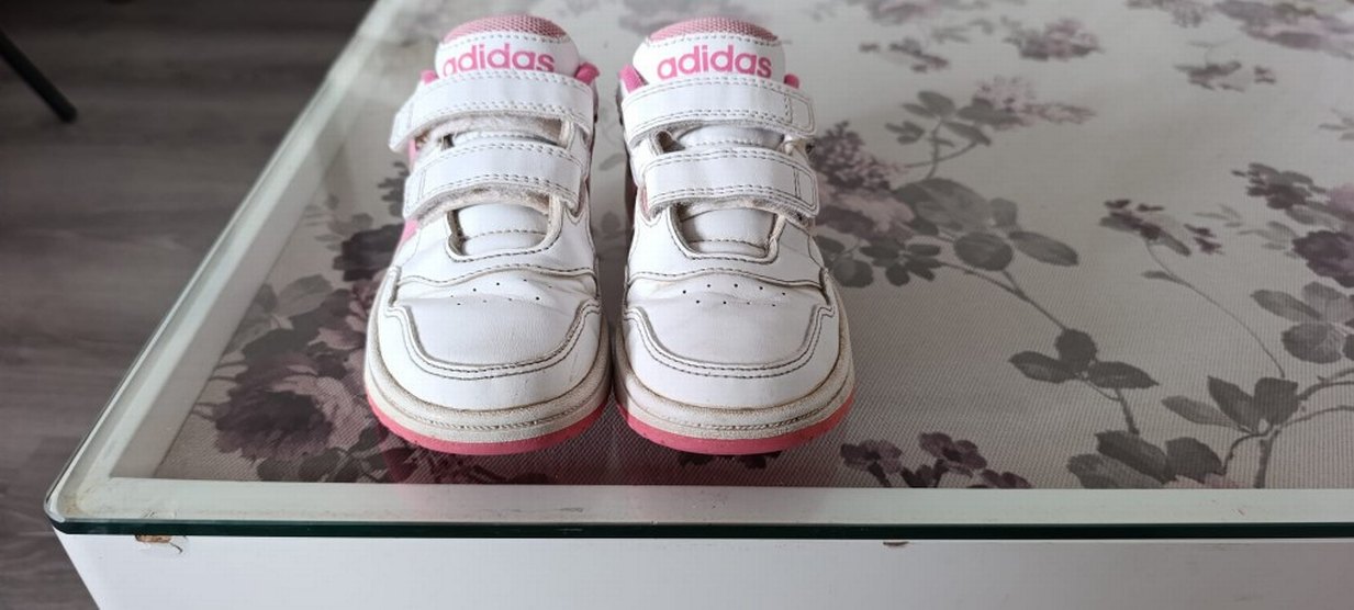 Beyaz Adidas kız çocuk spor ayakkabısı, cırt cırtlı ve kauçuk tabanlı, rahat ve günlük kullanıma uygun.