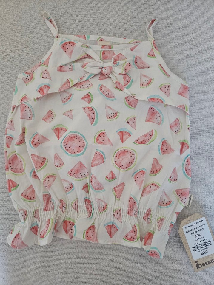 Etiketli. Askılı, fırfırlı, bol kesim kız çocuk bluz. Yumuşak sentetik kumaştan, pastel karpuz desenli