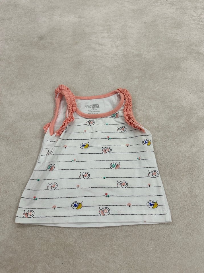Kolsuz, askısız yaka ve omuzlarda fırfır detaylı kız çocuk atlet. Yumuşak pamuktan, bol kesim, beyaz üzerine pastel baskılı salyangoz deseni ile trend sokak stili için uygun. Boy 28 cm (4.ç) #bebek #giyim #kıyafet