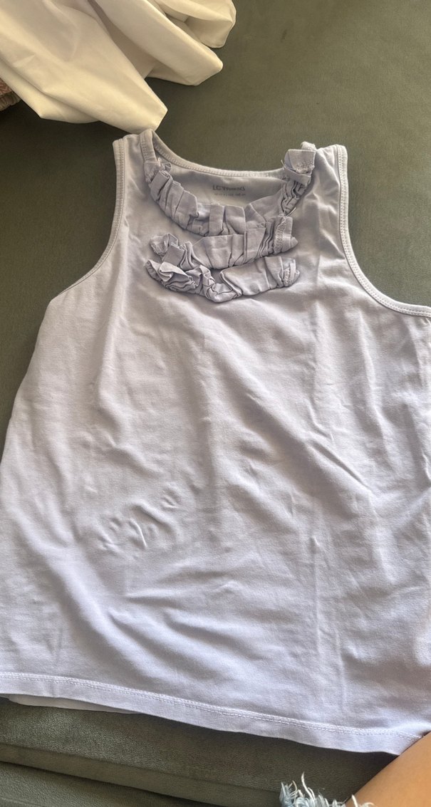 Beyaz renkte, kolsuz, yumuşak kumaştan yapılmış kız çocuk atlet bluz. Yaka kısmında süslü fırfırlar bulunur, desensiz sade tasarım.