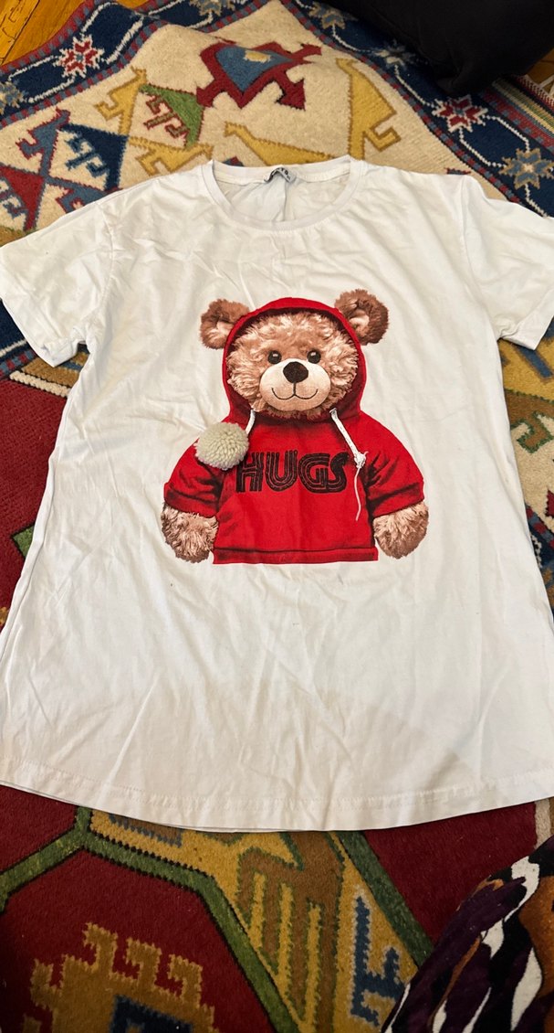 Kız çocukları için bol kesim, kısa kollu, yuvarlak yaka tişört. Kırmızı kapüşonlu ve kürklü ayıcık baskısı ve üzerinde "HUGS" yazısı bulunur. Yumuşak ve sıcak kumaştan üretilmiştir.