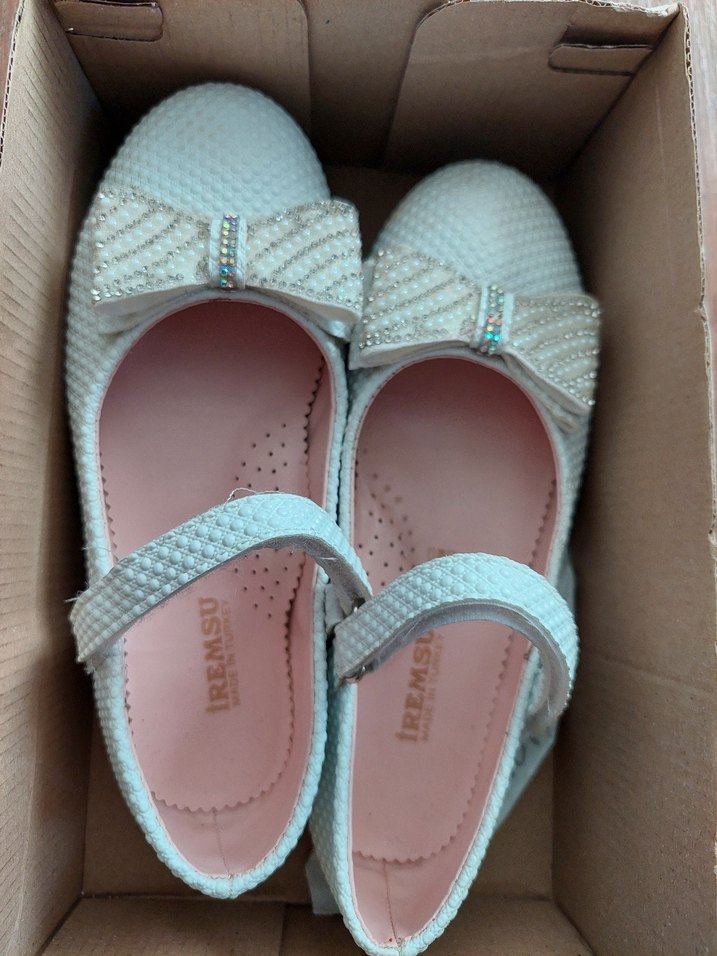 Kız çocukları için beyaz yılan desenli babet. Tokalı bantlı ve süslü fiyonklu, yumuşak kauçuk malzeme kullanılmış. 33 numara 2-3 kez kullanıldı iyi durumda