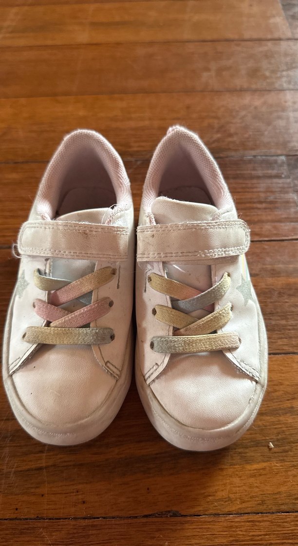 Beyaz kız çocuk spor ayakkabısı, pastel tonlarda bağcıklar ve cırt cırtlı bant ile, kauçuk tabanlı, günlük sokak stili için uygundur.