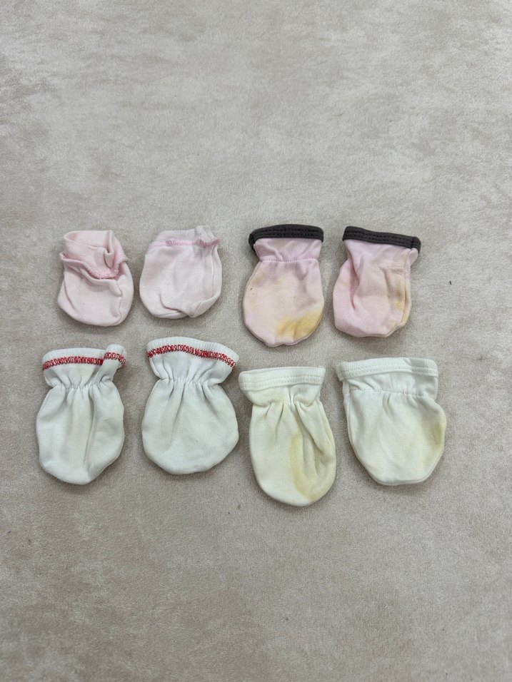 Kız çocukları için beyaz renkli, pastel bağlama deseniyle yumuşak ve sıcak kumaştan yapılmış eldivenler. Rahat ve sade bir tarz sunar. (2.ç) #bebek #giyim #zıbın #elbise