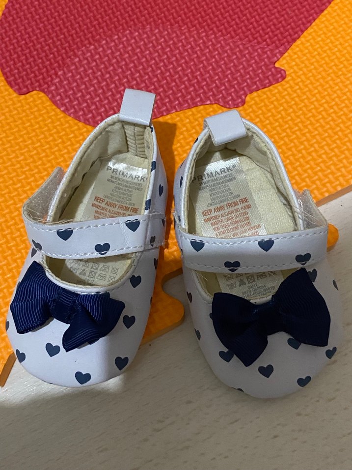 Beyaz kauçuk kız çocuk balet ayakkabıları, renkli kalp desenli, fırfırlı ve önünde lacivert fiyonk detaylıdır. Rahat ve trend.