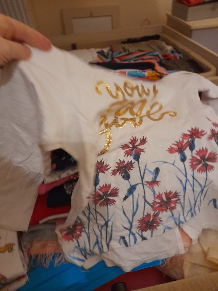 Beyaz renkli, uzun kollu, straplez yaka ve bol kesim kız çocuk tişörtü. Çiçek desenli ve altın renkli baskı detaylıdır.