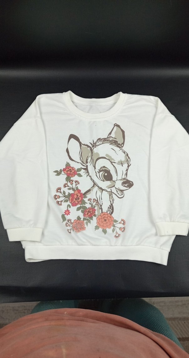 Pamuklu beyaz sweatshirt, renkli baskılı geyik ve çiçek desenli, dantel detaylıdır. Yuvarlak yaka, uzun kollu ve bol kesimdir, günlük sokak stili için uygundur.