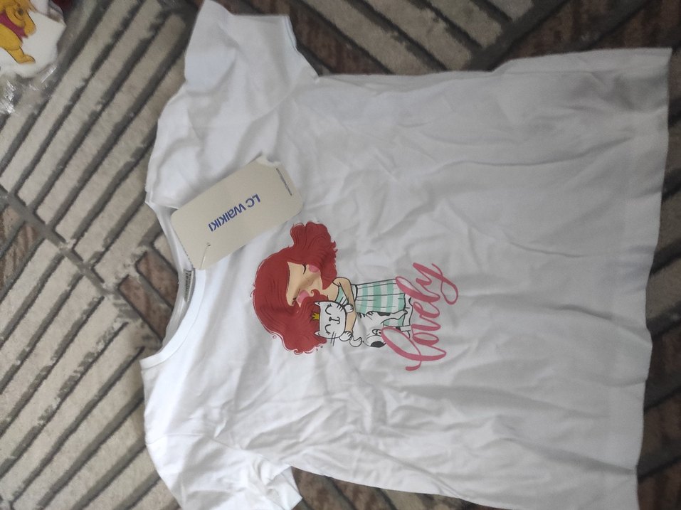 Pamuk kumaştan, dantel detaylı baskılı beyaz kız çocuk tişörtü. Kısa kollu, yuvarlak yaka ve bol kesim modeldir, rahat bir sokak stili sunar.