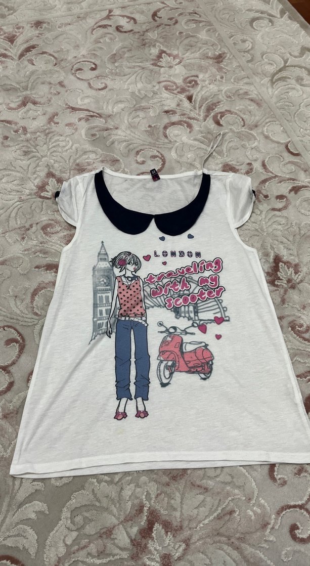 Beyaz, pamuklu, kolsuz, bol kesim tişört. Üzerinde kız ve scooter baskısı, dantel yaka detayı bulunur. Trendy casual tarz için uygundur.