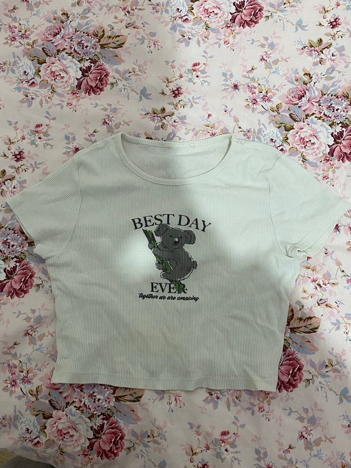 Pamuklu kumaştan, kısa kollu, bisiklet yaka, baskılı koala figürlü ve 'BEST DAY EVER' yazılı, dantelli beyaz kız çocuk tişörtü.