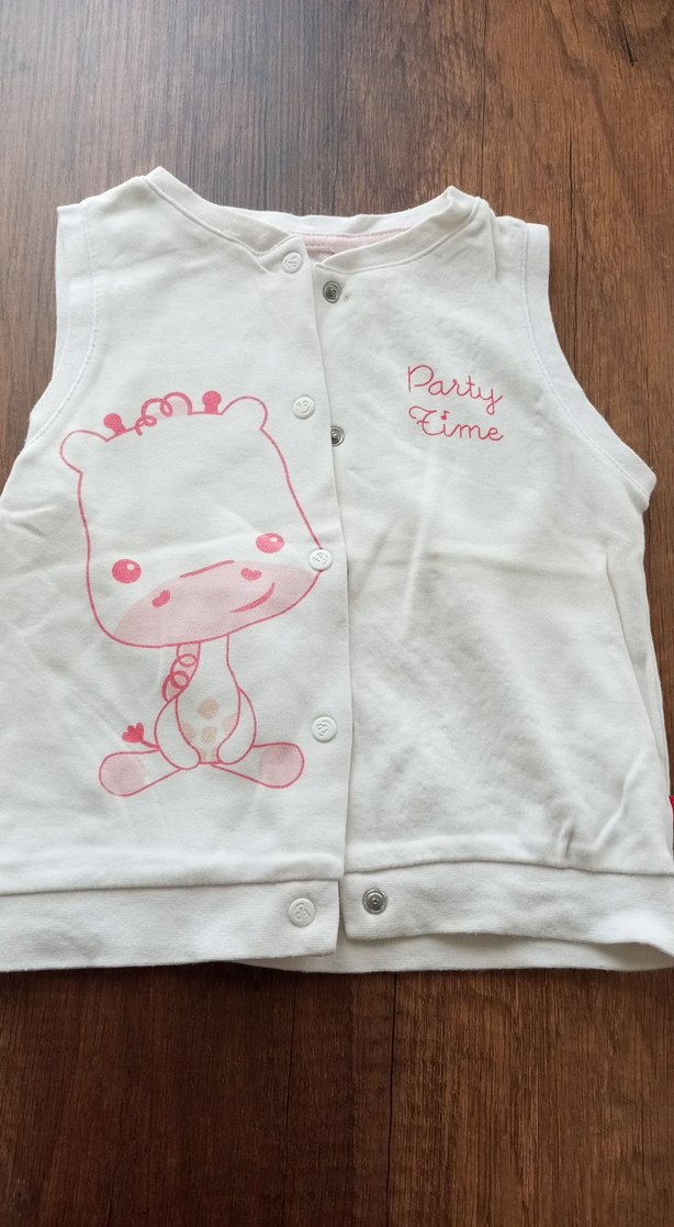 Kız çocuklar için beyaz, baskılı zürafa ve 'Party Time' yazılı, düğmeli ve ince kesim kolsuz yelek.