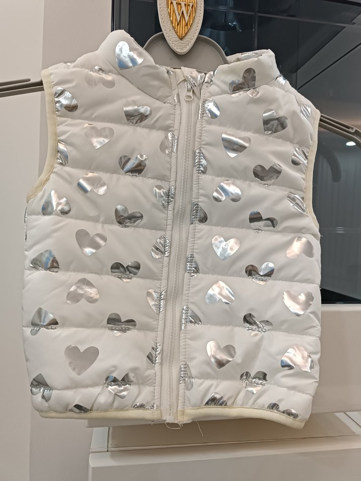 Yumuşak kumaştan yapılmış, fermuarlı ve parlak baskılı kalp desenlerine sahip beyaz, kolsuz, fitted kesim kız çocuk yeleği. Casual sokak stili için uygun.