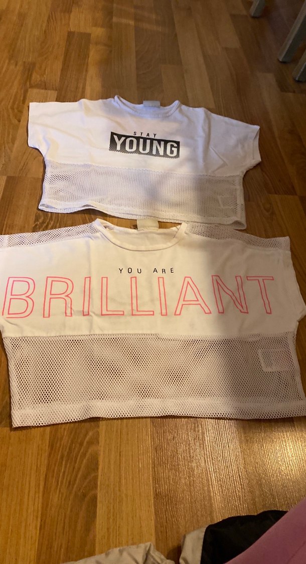 Kız çocukları için kısa kollu, beyaz, baskılı ve file detaylı tişörtler. Biri Velcro kapamalı, üzerinde "STAY YOUNG" ve "YOU ARE BRILLIANT" yazıları bulunur. 7.8 yaş temiz ürün