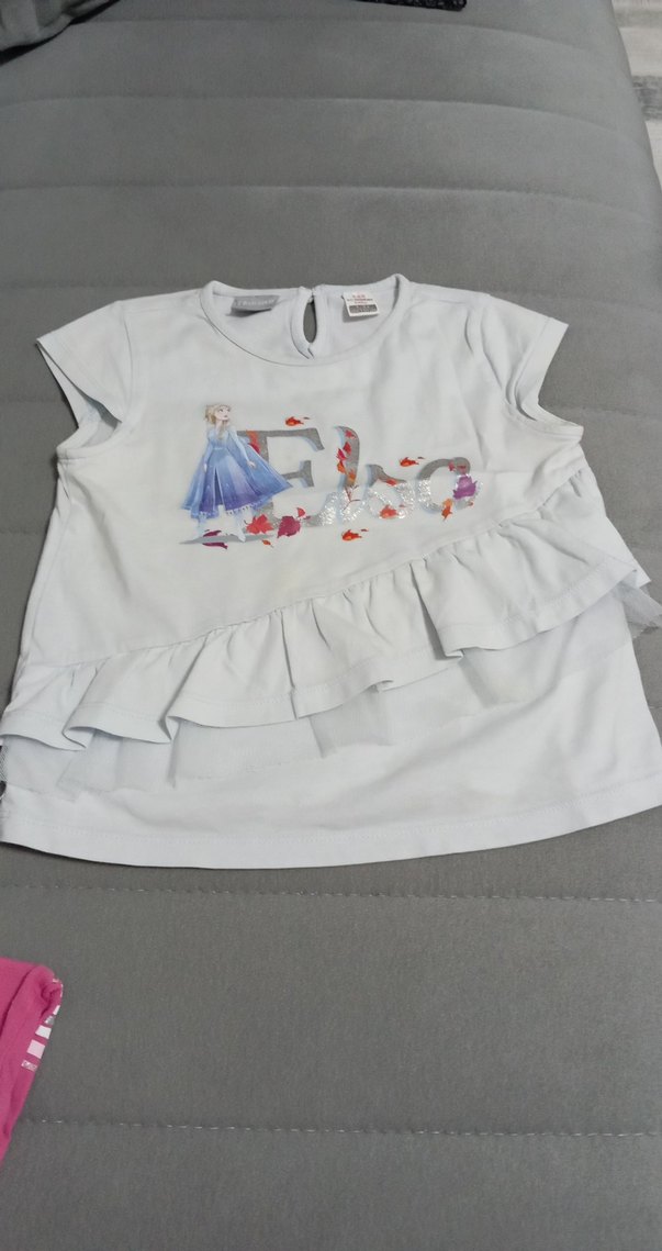Kız çocuk beyaz tişört, kısa kollu ve yuvarlak yaka. Baskılı desen ve fırfır detaylarıyla, yumuşak ve sıcak kumaştan üretilmiştir. Rahat kesim, sokak stili için uygun.