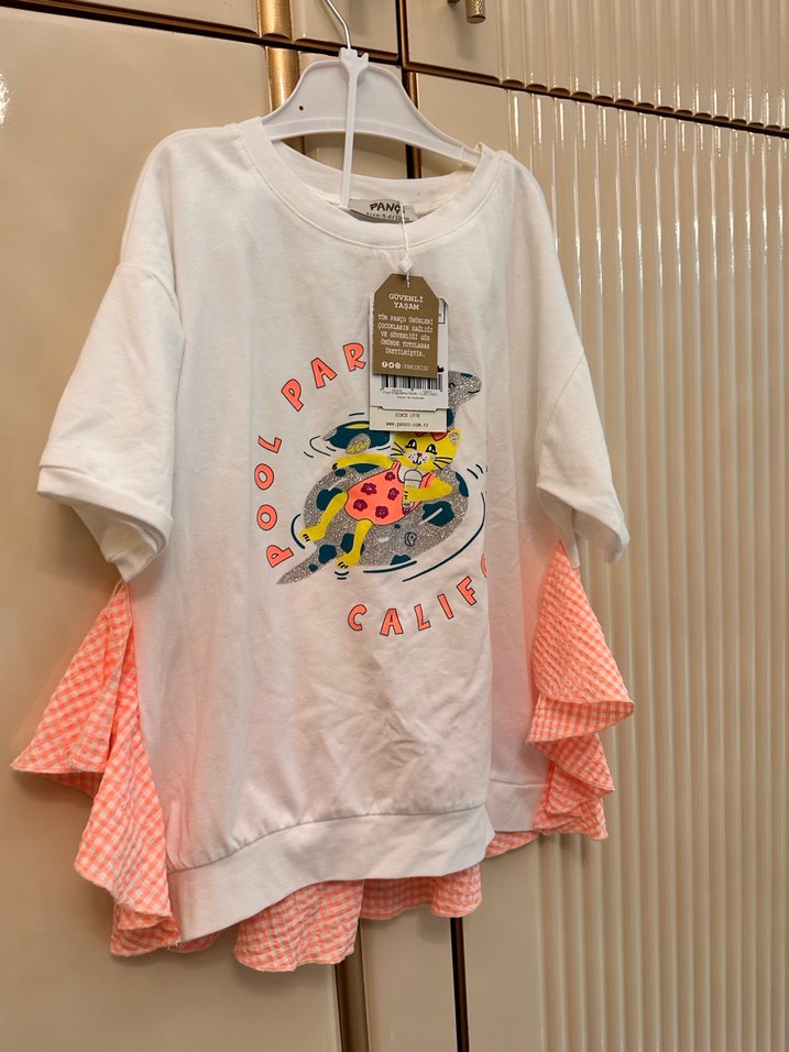 Kız Çocuk Beyaz Baskılı Fırfırlı Tişört taytlı 2 li takım
