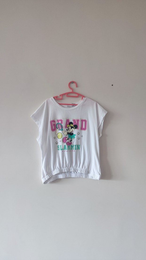 Kız çocukları için beyaz, pamuklu, kısa kollu, baskılı ve bol kesim crop tişört. Ön kısmında renkli baskı ve lastikli alt kısmı ile rahat sokak stili sunar.