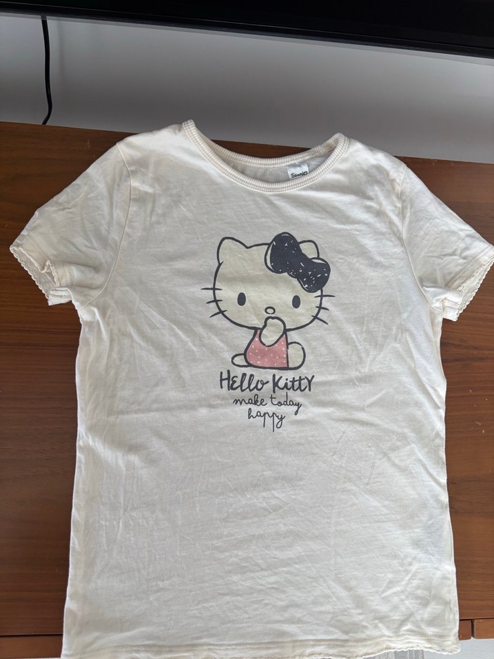 Pamuklu, beyaz, baskılı Hello Kitty figürlü, kısa kollu kız çocuk tişörtü. Sokak stiline uygun rahat bir model. 8-10 yaş yumuşacık kumaşı taytı ile kombin olsun diye almıştım Kızım çok severek giydi