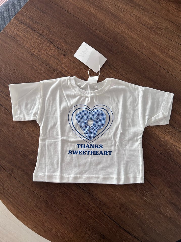 Pamuk beyaz kısa kollu, bol kesim, yuvarlak yaka kız tişörtü. Mavi kalp baskısı ve "THANKS SWEETHEART" yazısı bulunur.