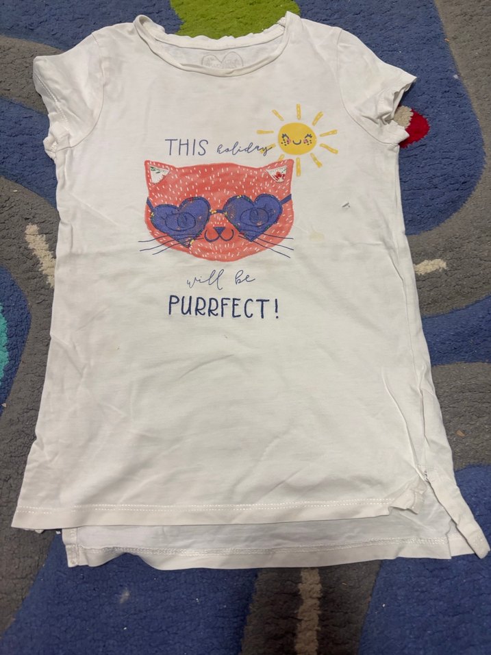 Pamuklu, kısa kollu, beyaz ve baskılı kız çocuk tişörtü. Önünde kalpli gözlük takan kedi ve "PURRFECT!" yazısı bulunur. İstediğiniz yaşta tşörtler bu ğrğnalr 4.5.6 yaş fiyat görseldir tolu alımda yardımcı olurum