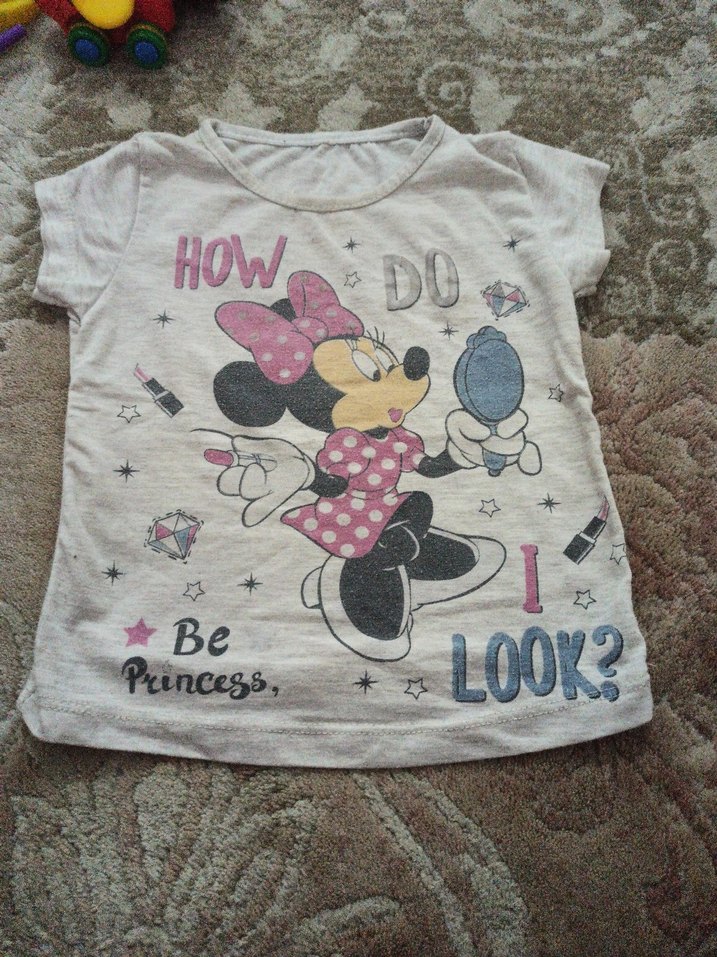 Pamuklu, beyaz renkli, kısa kollu ve bol kesim kız çocuk tişörtü. Pastel tonlarda Minnie Mouse baskılı ve eğlenceli yazılı. Yuvarlak yakalı.