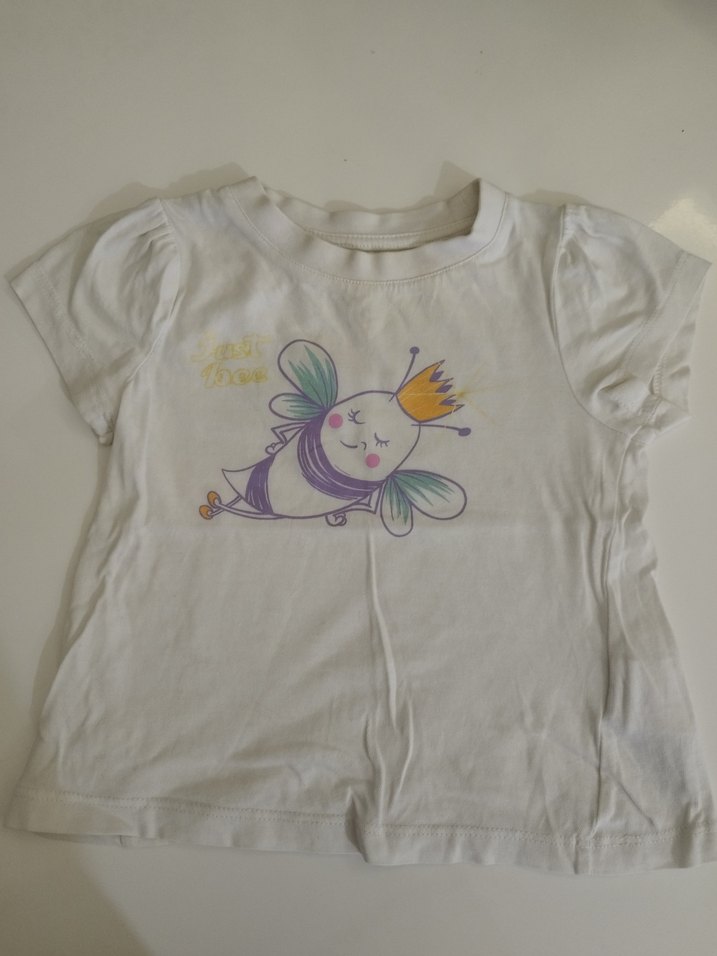 Pamuk beyaz tişört, kısa şişkin kollu, önünde pastel renkli baskılı arı deseni bulunur. Bol kesim ve yuvarlak yaka şeklindedir.