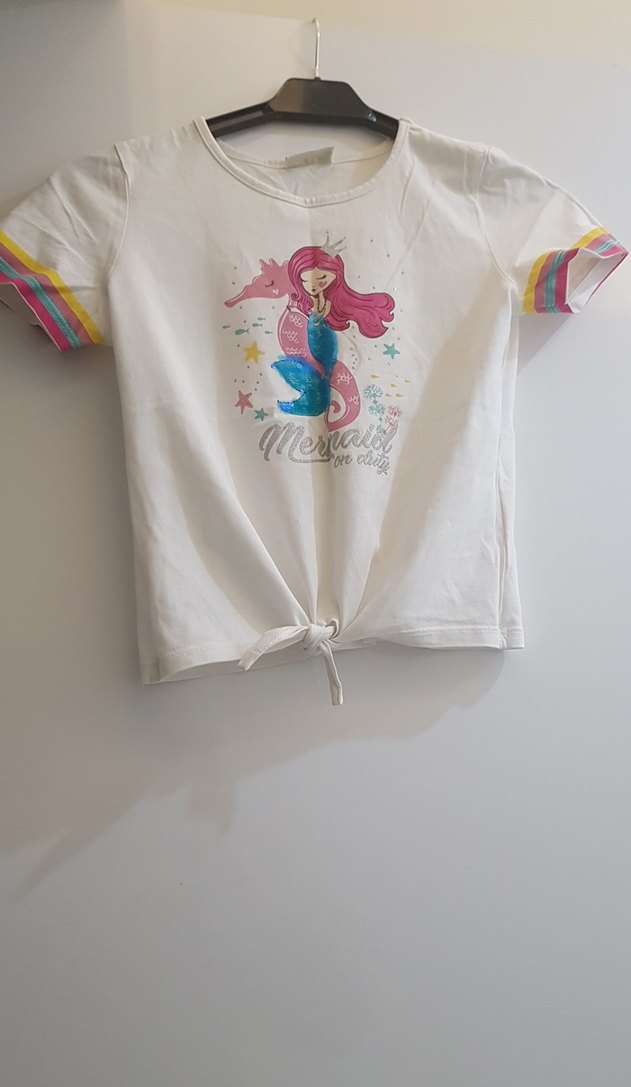 Kız çocuk beyaz tişört, kısa kollu ve renkli çizgili kollara sahip. Deniz kızı baskılı, yuvarlak yaka ve bol kesim. Altında bağlama detayı mevcut.