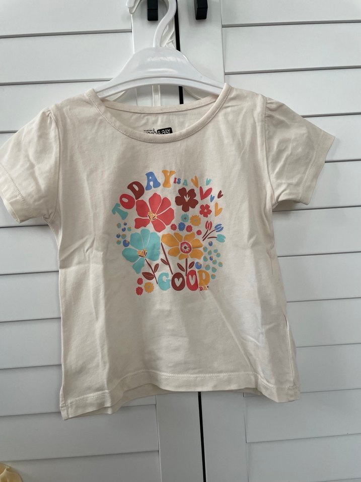 Pamuklu, kısa kollu, beyaz kız çocuk tişörtü. Bol kesim ve yuvarlak yaka. Önünde renkli çiçek baskısı ve 'TODAY IS A GOOD DAY' yazısı var.