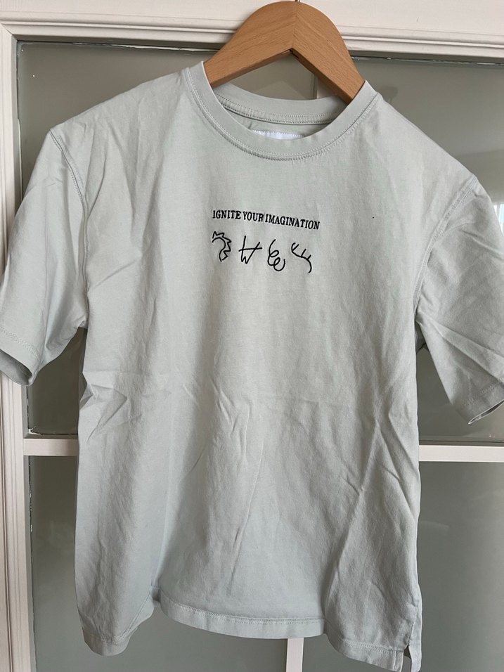 Beyaz renkli kız çocuk tişörtü, kısa kollu ve yuvarlak yakalıdır. Pamuk kumaştan, bol kesimdir ve üzerinde "IGNITE YOUR IMAGINATION" baskısı vardır.