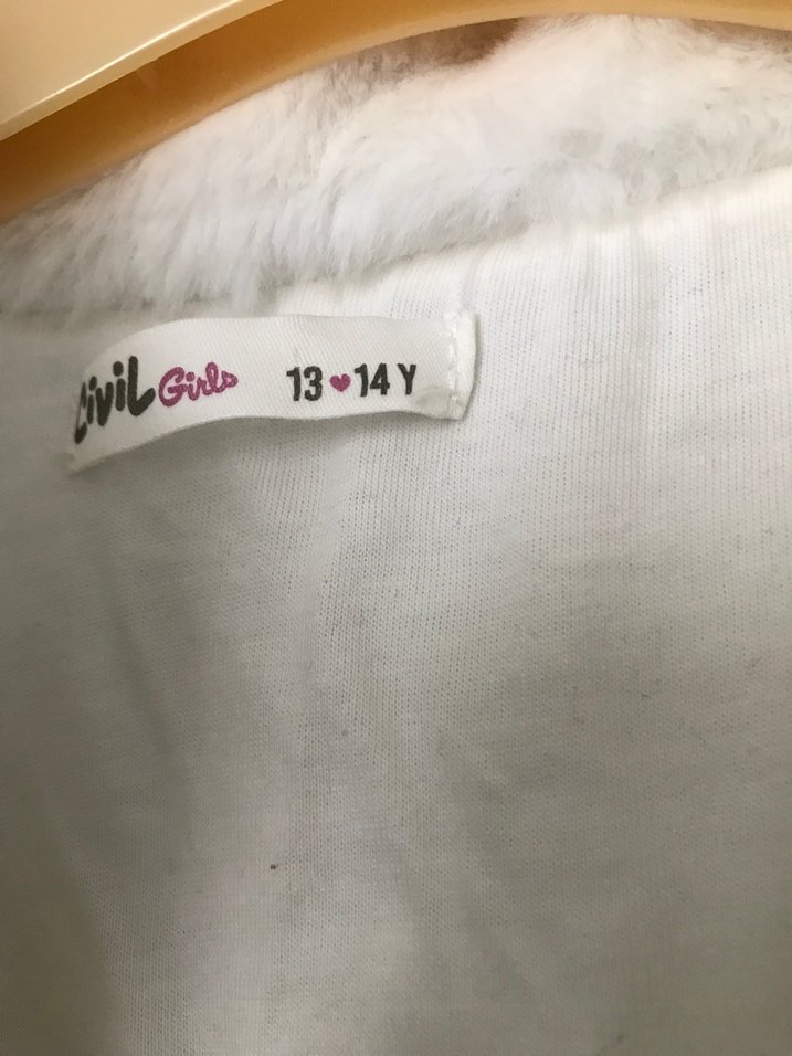 Baskılı desene ve kürk detayına sahip beyaz, vücuda oturan kız çocuk yeleği. Yumuşak ve sıcak kumaş, uzun kollu ve yuvarlak yaka ile sokak stiline uygun dar kalıptır.