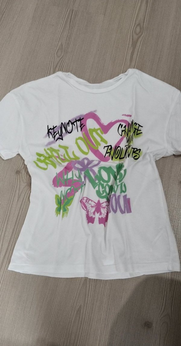 Rahat kesim beyaz pamuk tişört, kısa kollu ve yuvarlak yakalı, renkli baskılar ve 'KEYNOTE' yazılı.
