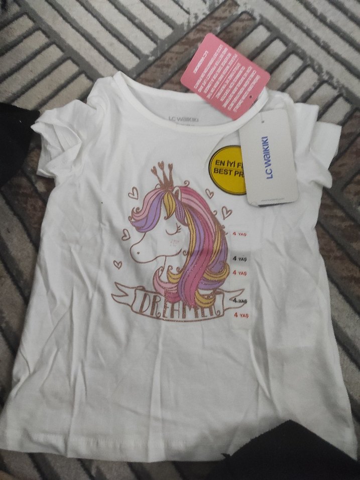 Beyaz pamuklu, kısa kollu ve dar kesim kız çocuk tişörtü. Renkli tek boynuzlu at baskısı ve "Dream Big" yazısı bulunur. Rahat ve şık.