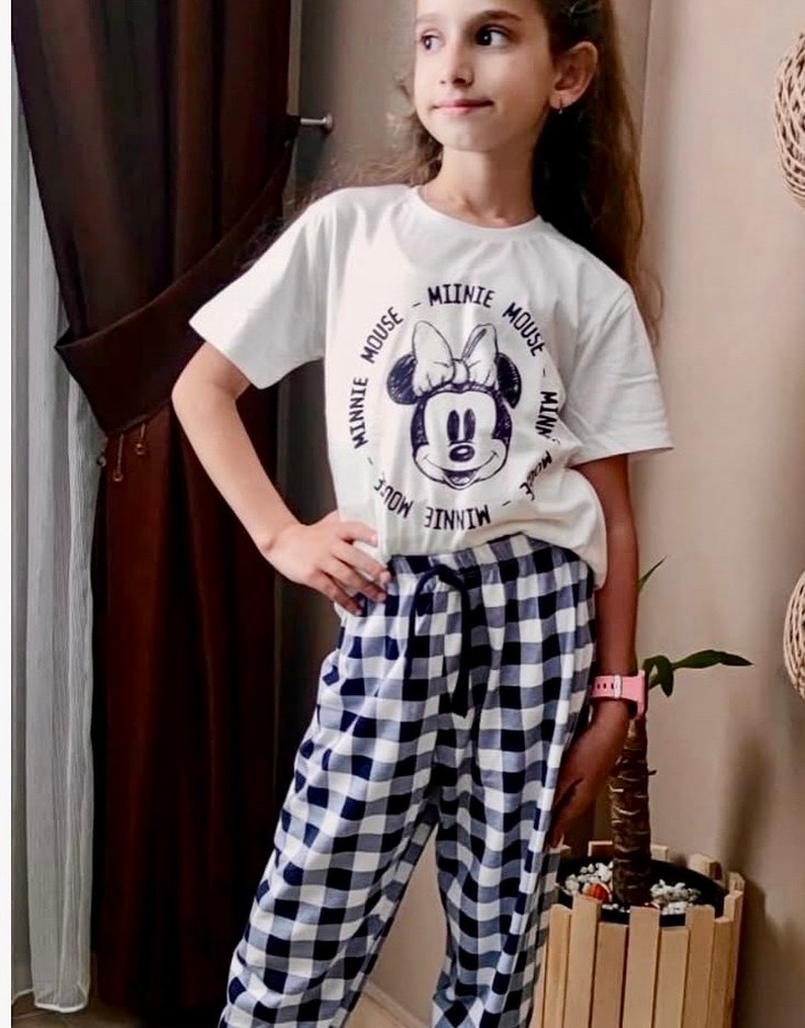 Pamuklu beyaz tişört, kısa kollu ve bisiklet yaka, Minnie Mouse baskılı, rahat ve şık görünümlü.