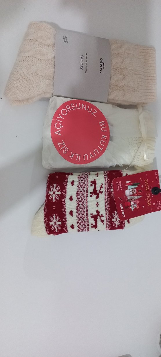 Kız çocukları için yumuşak ve sıcak kumaştan, açık beyaz renkte baskılı çoraplar. ❄️