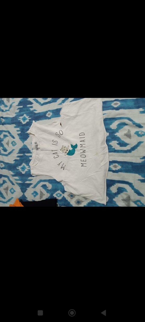 Beyaz straplez kız çocuk tişörtü, kısa kollu ve pamuklu yumuşak kumaştan bol kesimdir. 'My cat is so meowmaid' baskılı, rahat sokak tarzı için uygundur.