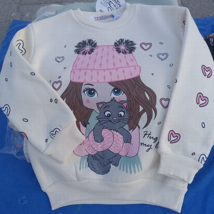 Yumuşak polar kumaştan, ince örgü detaylı, baskılı, beyaz renkli, bol kesim kız çocuk sweatshirt, yuvarlak yaka ve uzun kolludur.