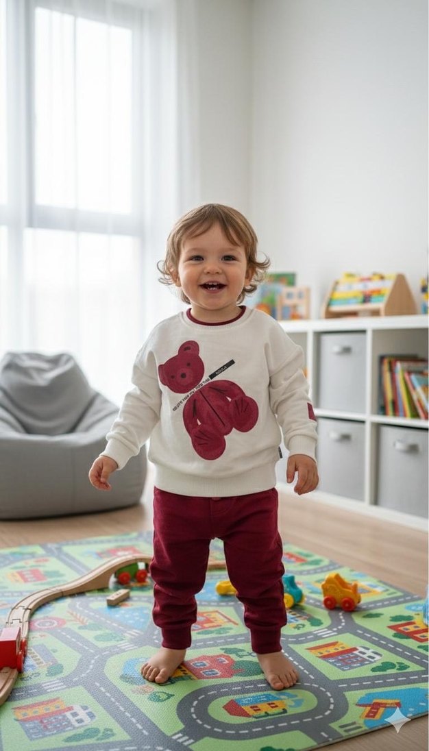 Beyaz renkli, uzun kollu ve bisiklet yaka kız çocuk sweatshirt, kabartmalı ayı baskılı. Bordo eşofman altı ile takım, yumuşak ve sıcak kumaştan yapılmıştır.
