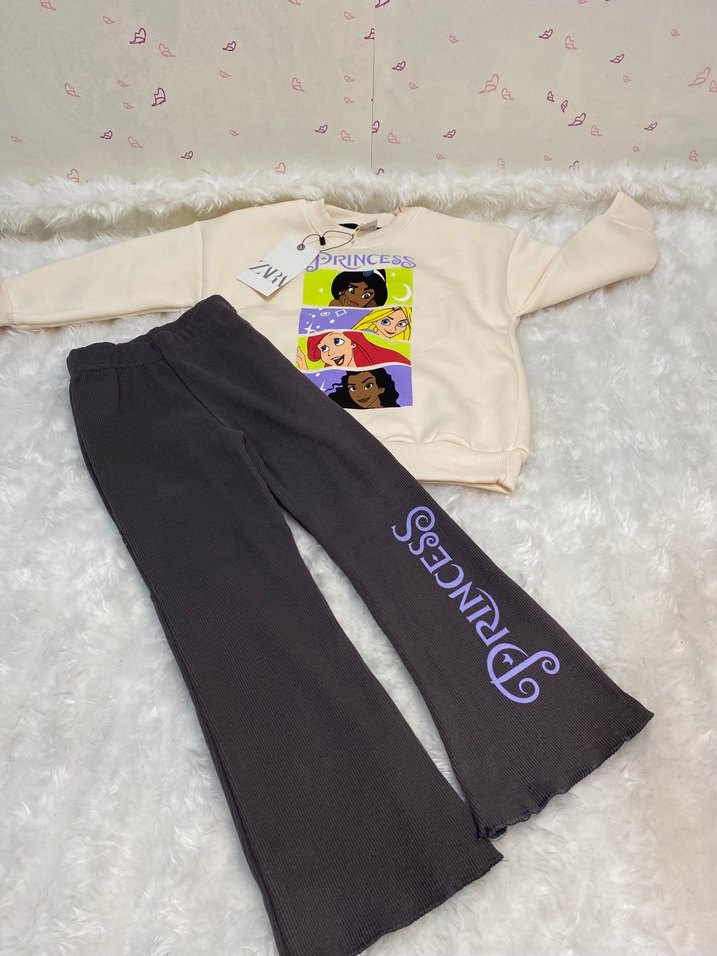 Kız çocukları için beyaz baskılı sweatshirt ve siyah bol kesim eşofman. Yumuşak, sıcak kumaş ve kürk detaylarıyla rahatlık sağlar.